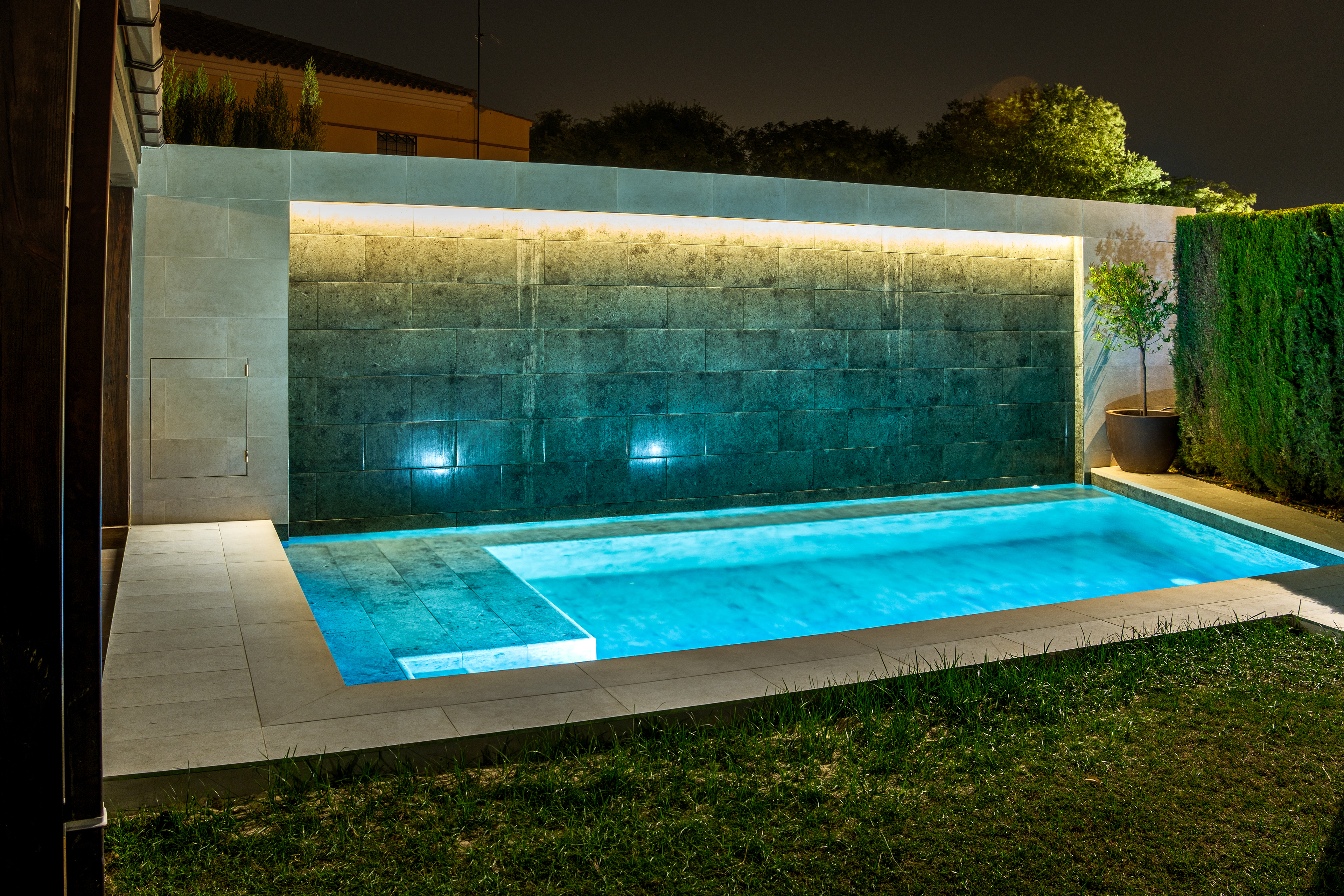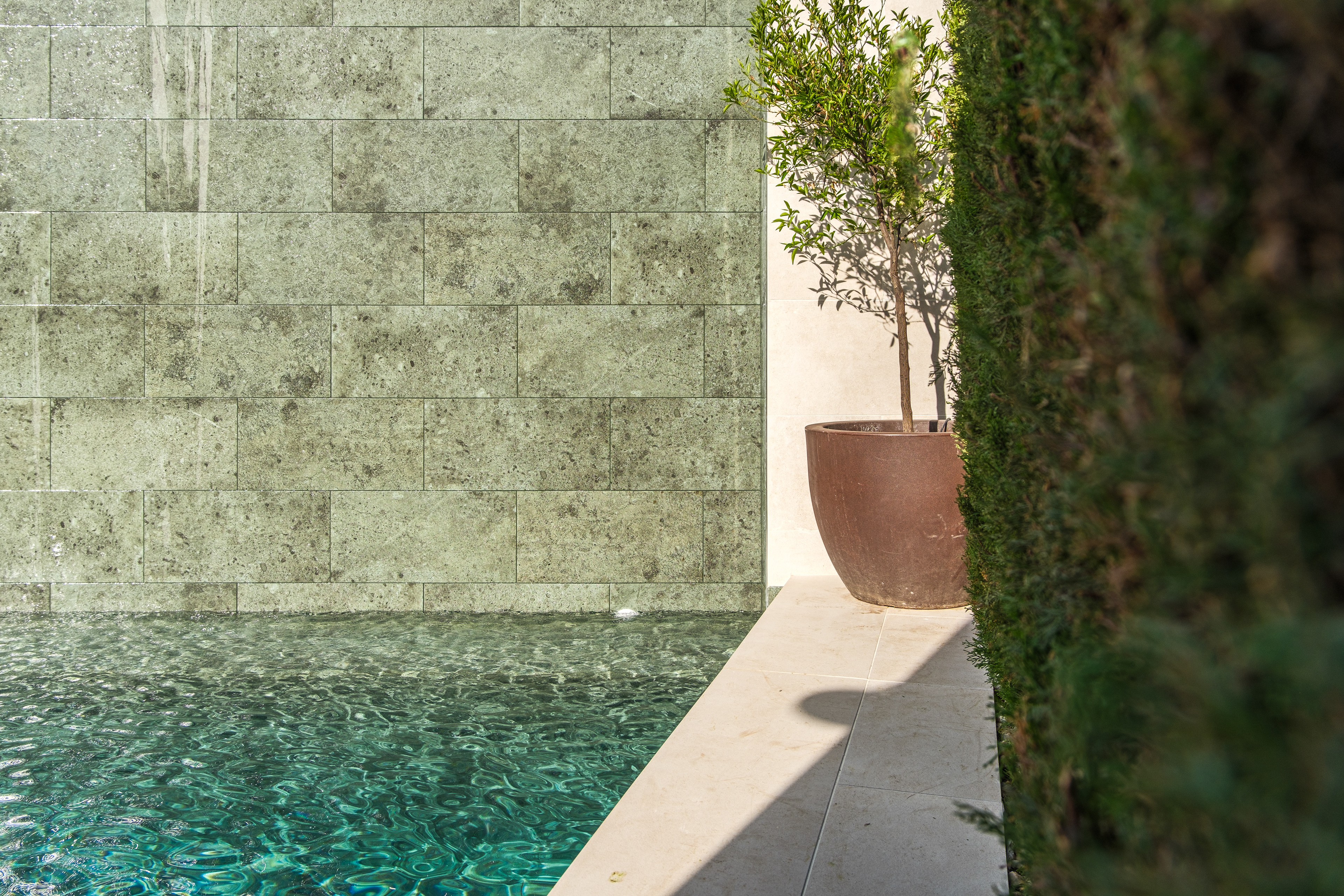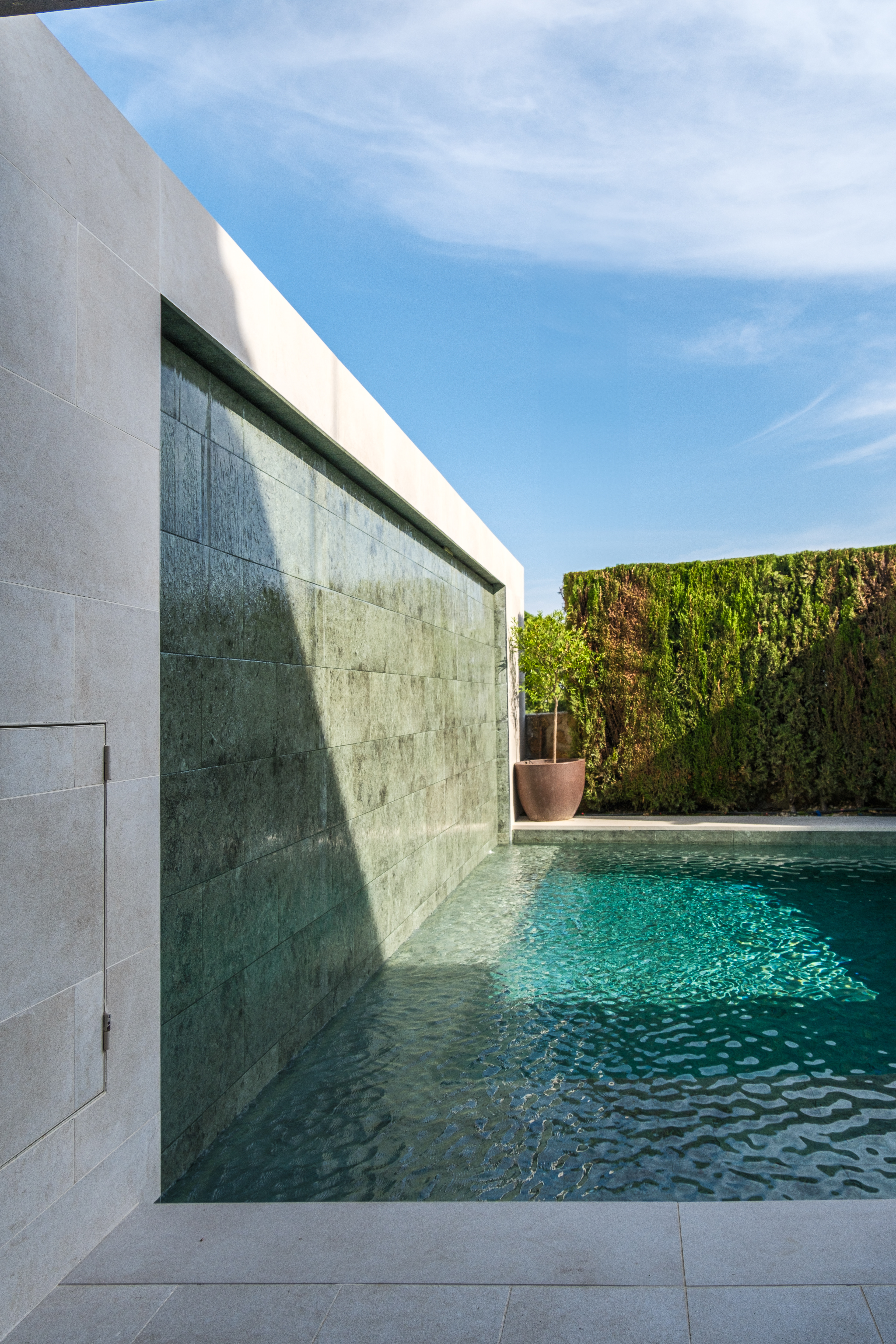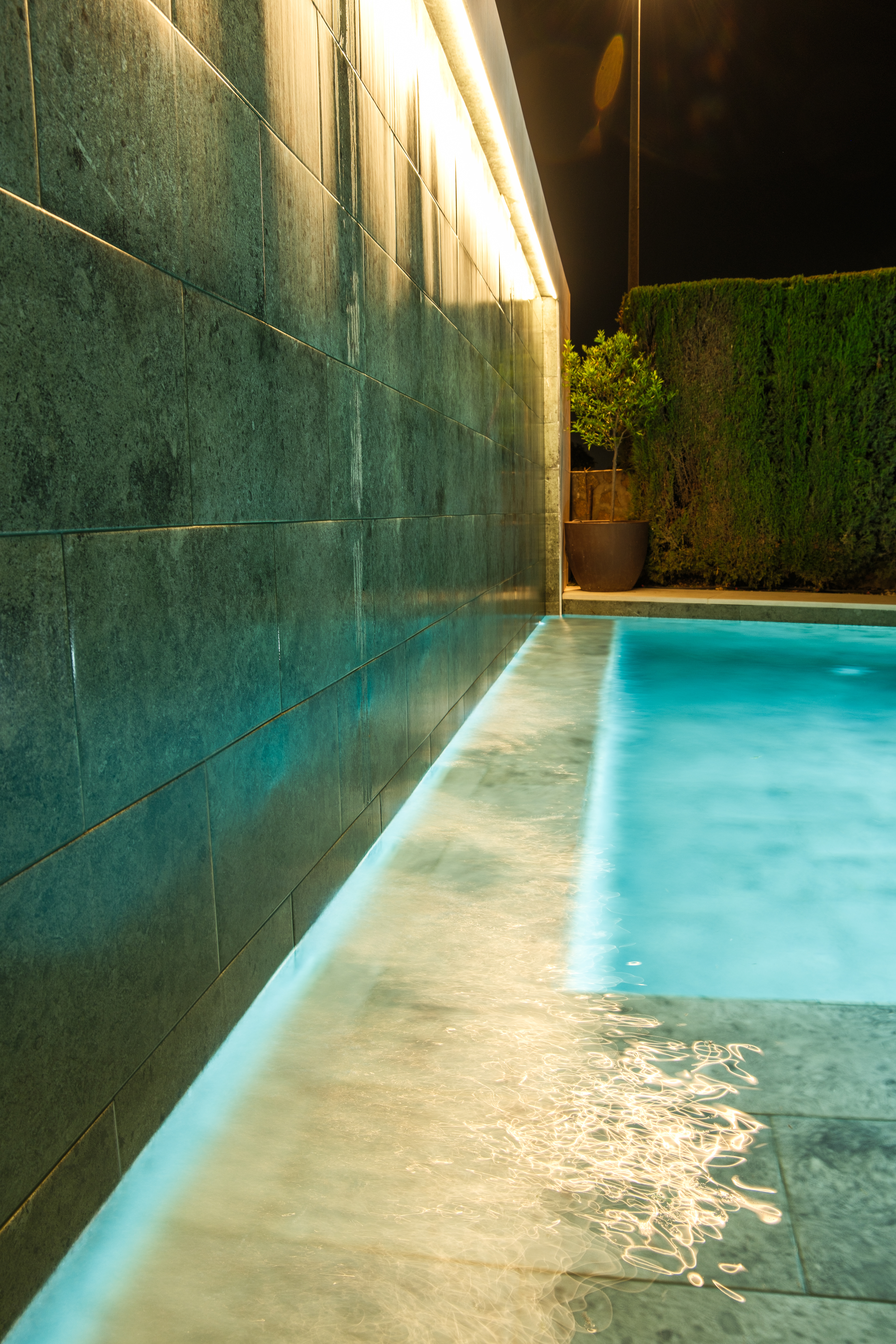 El efecto WOW conseguido en una piscina. Reflejar los colores, la dimensión y el diseño destacando los nuevos materiales empleados es fundamental para el cliente, quien desea resaltar el atrevido cambio del clásico gres al PORCELÁNICO y VERDE BALI.
