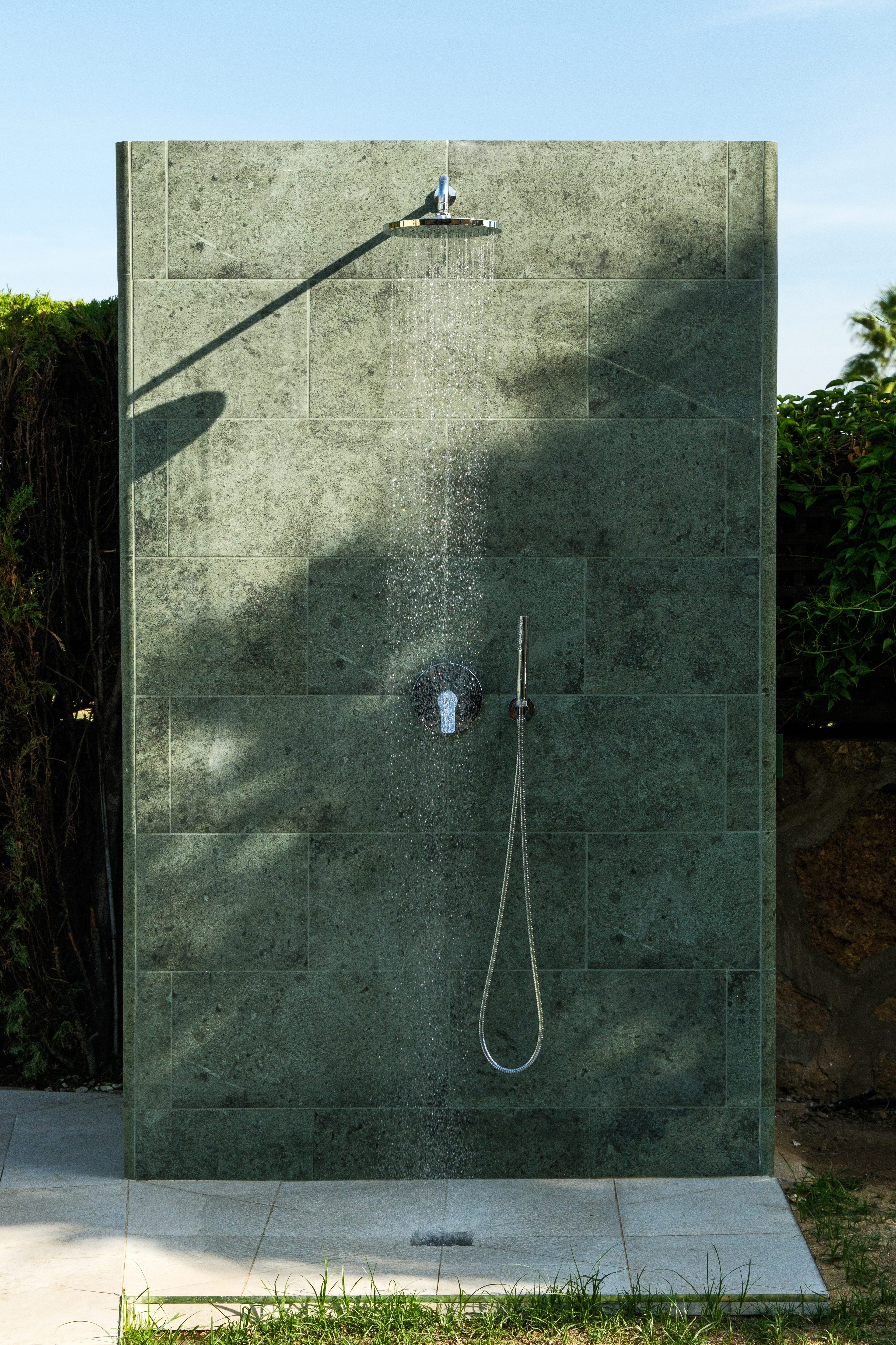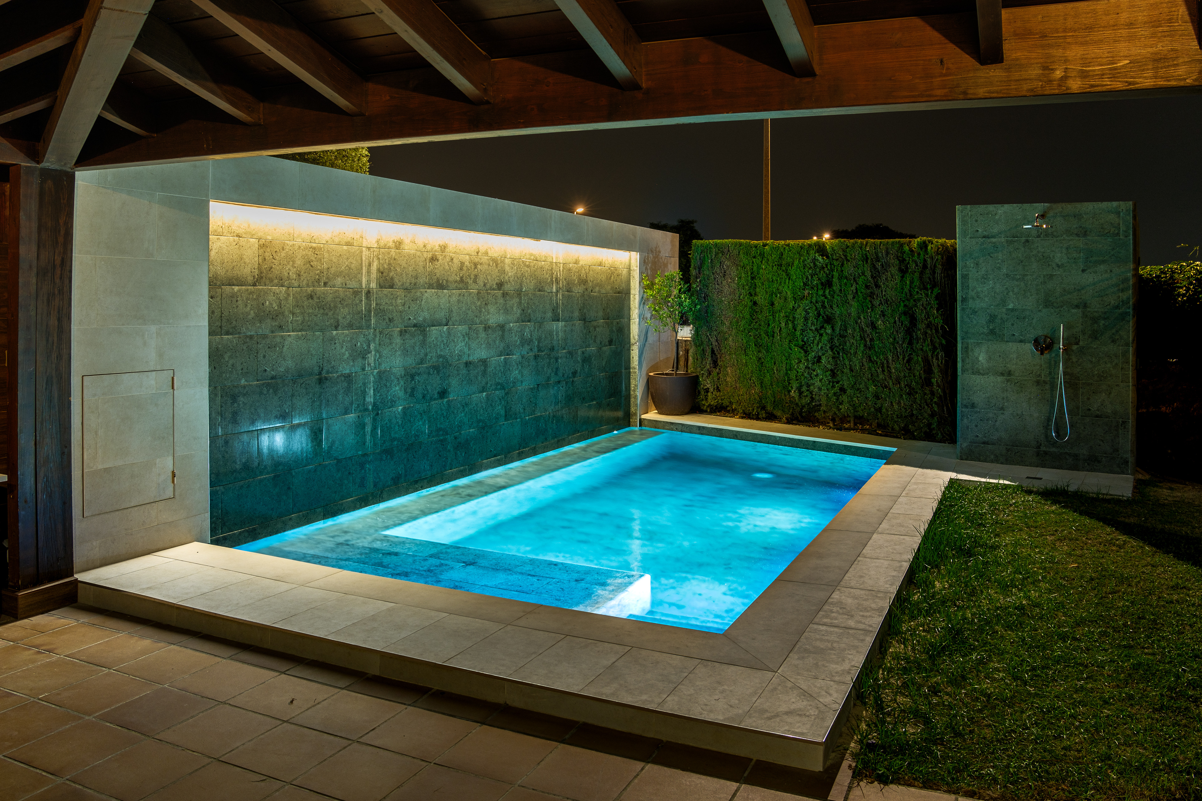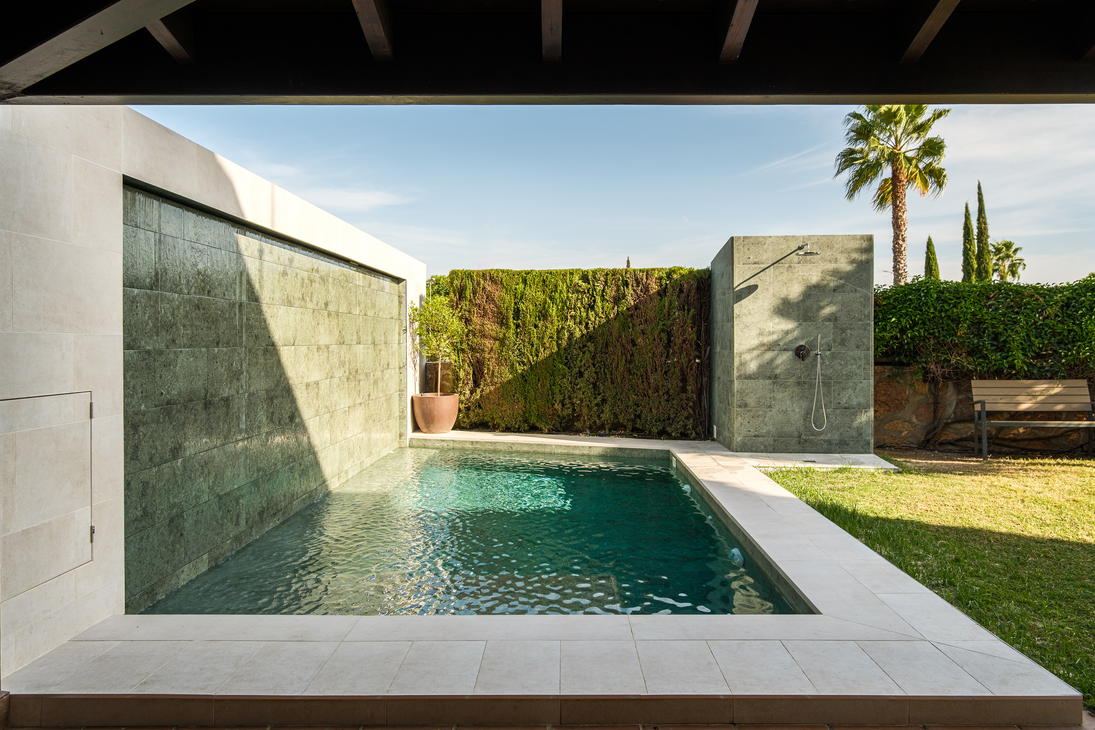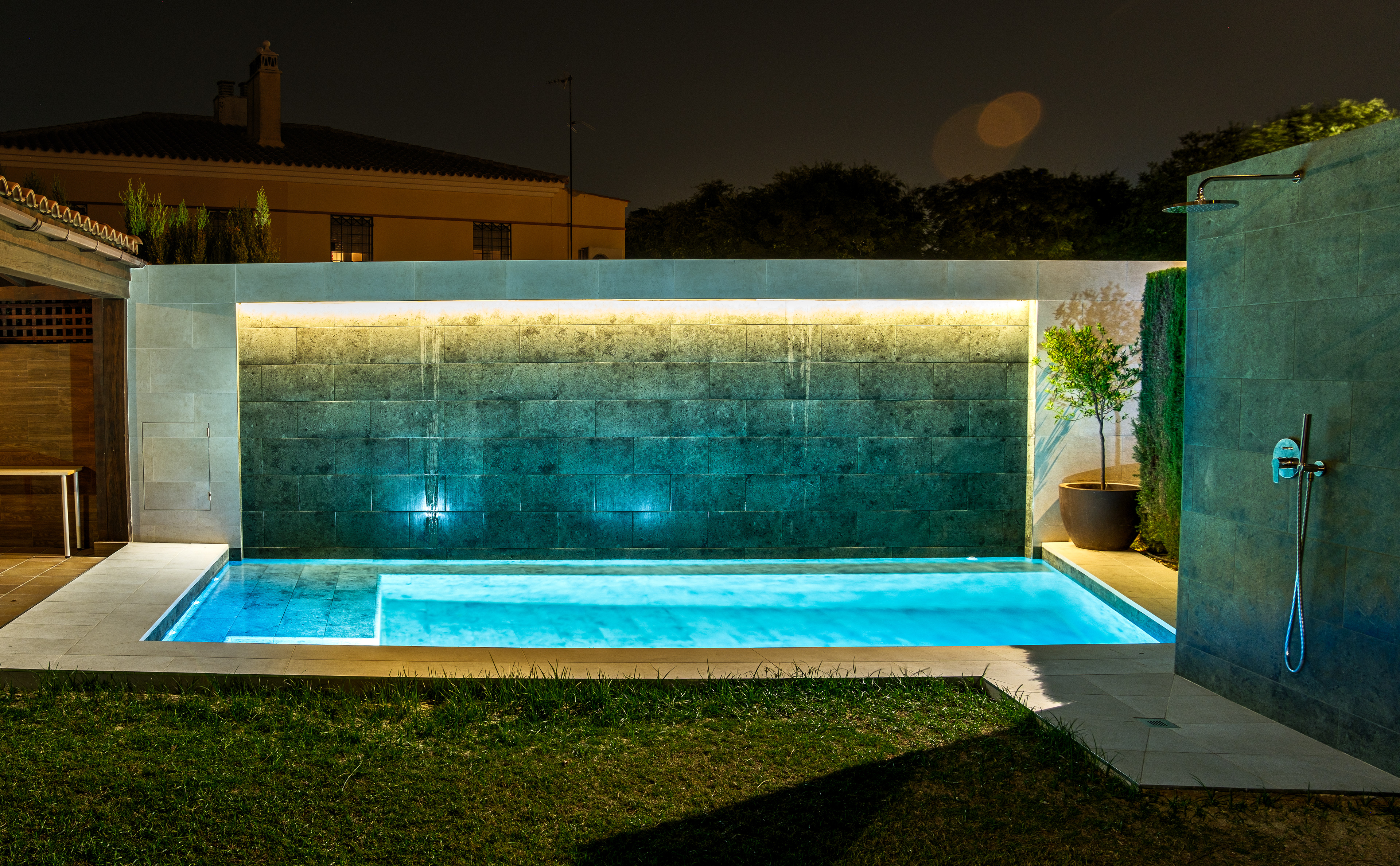 El efecto WOW conseguido en una piscina. Reflejar los colores, la dimensión y el diseño destacando los nuevos materiales empleados es fundamental para el cliente, quien desea resaltar el atrevido cambio del clásico gres al PORCELÁNICO y VERDE BALI.